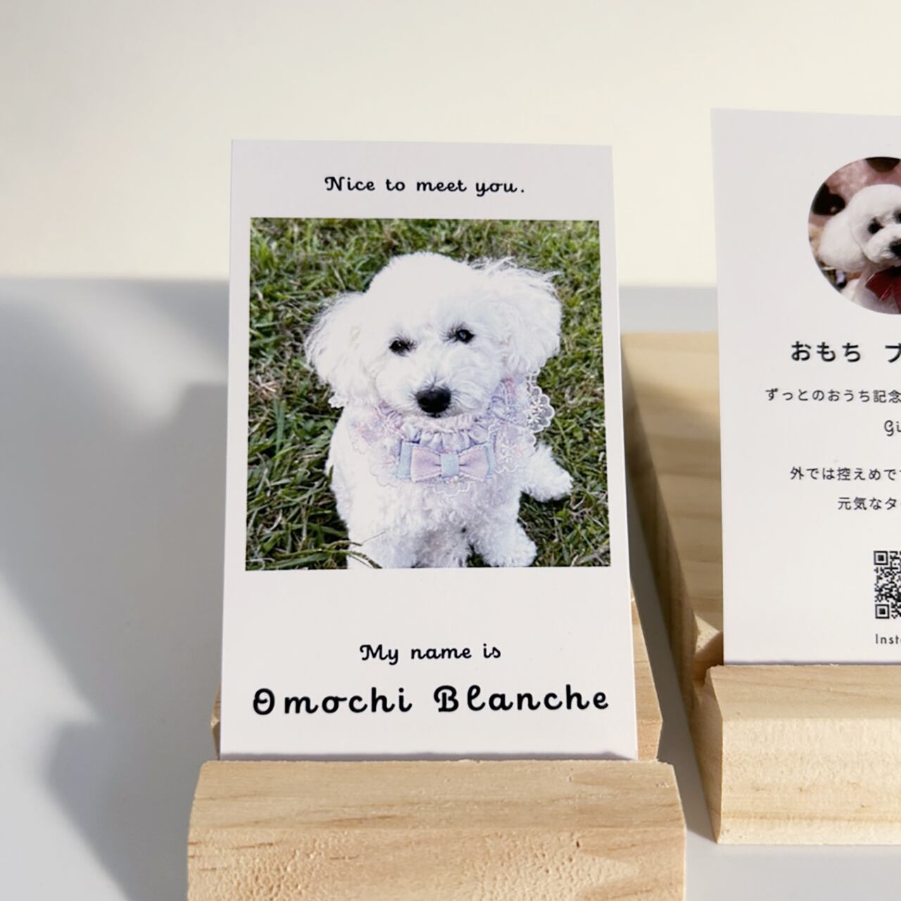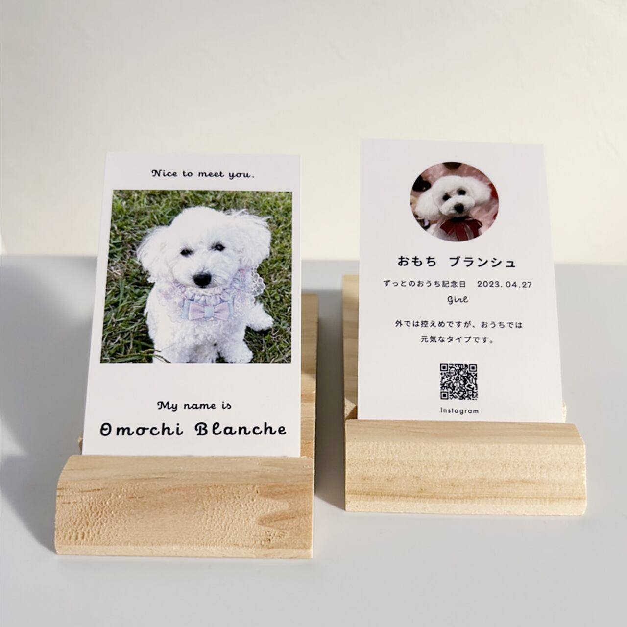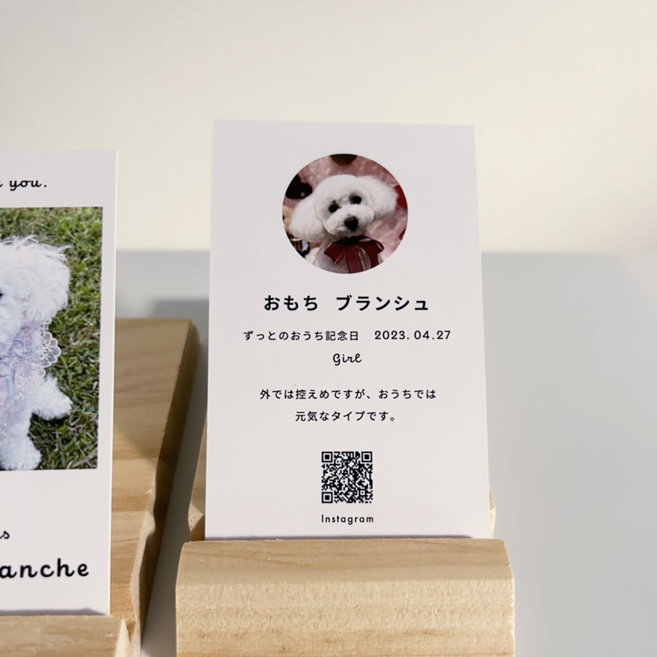 表面にはお気に入りのお写真、裏面にはお名前・誕生日・性格やエピソード・SNSのQRコードなどをお入れできます。文字やお色の変更も可能ですので、世界にひとつだけの名刺に仕上げます。