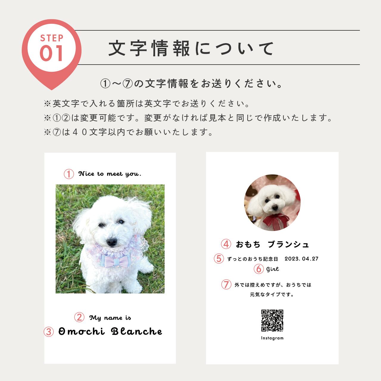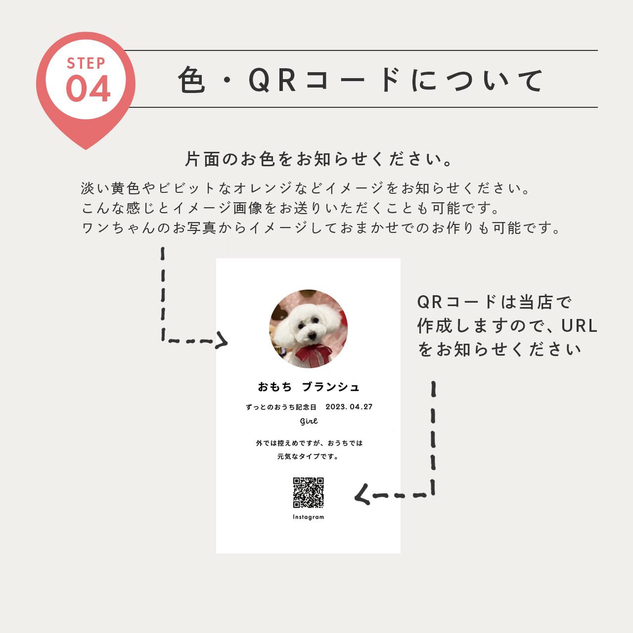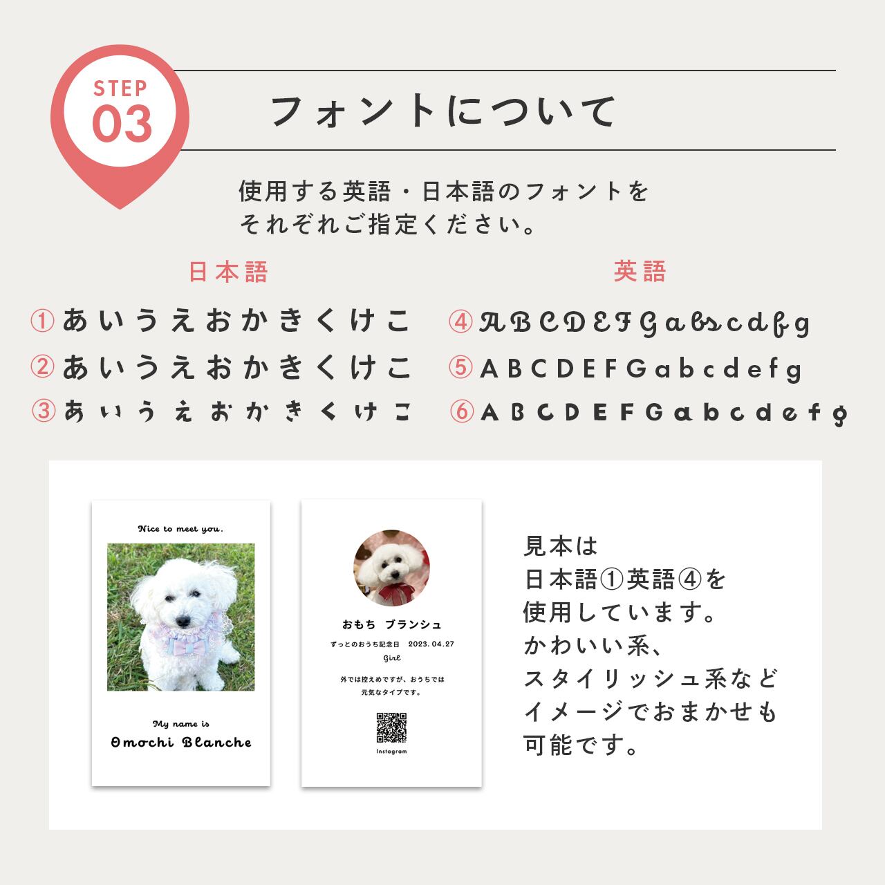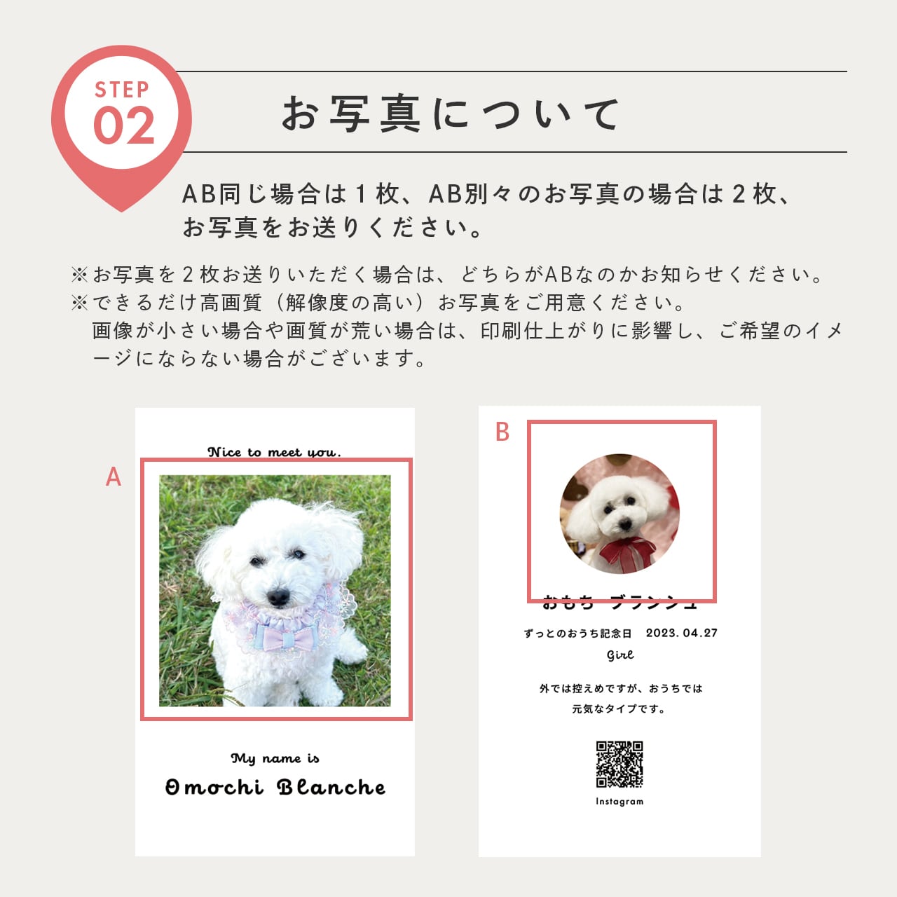 表面にはお気に入りのお写真、裏面にはお名前・誕生日・性格やエピソード・SNSのQRコードなどをお入れできます。文字やお色の変更も可能ですので、世界にひとつだけの名刺に仕上げます。