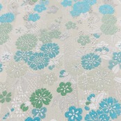 アイボリーを基調に、白や水色、グリーンの花々が瑞々しく織り出され、明るく柔らかな印象に仕上がっています。